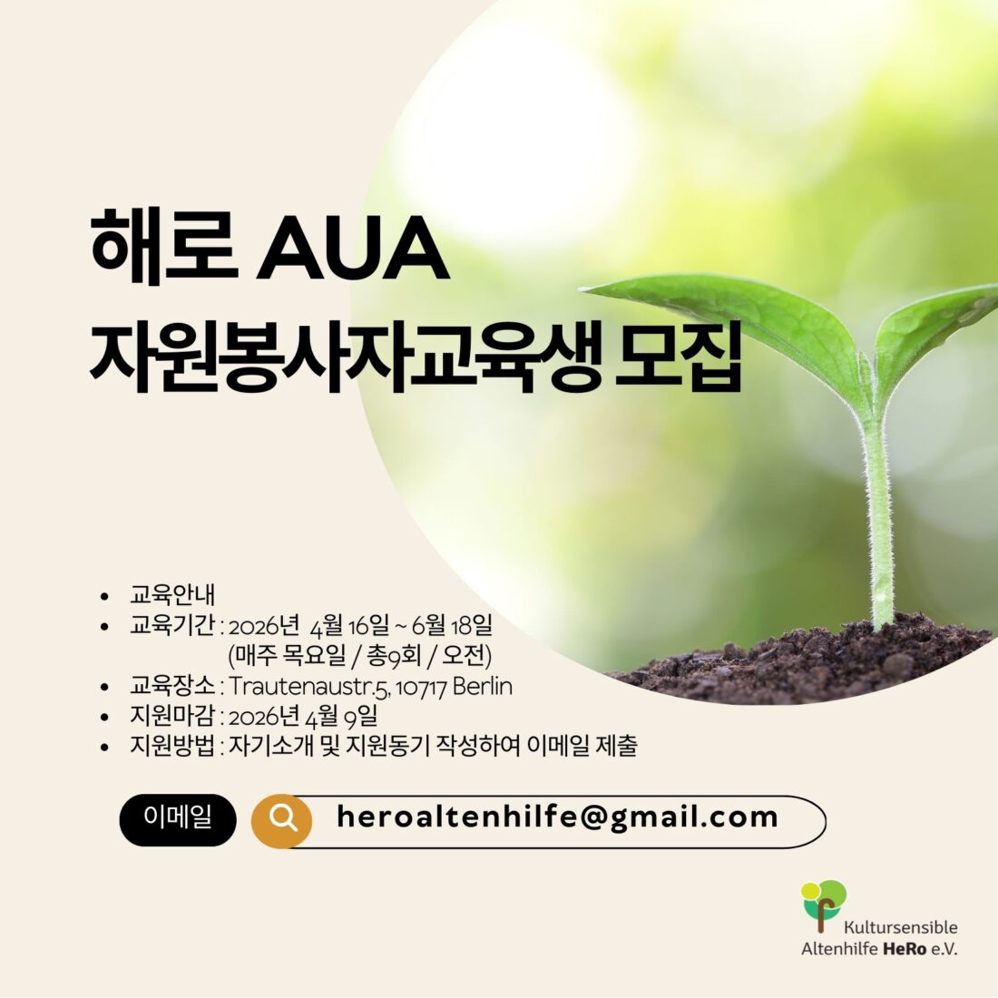 베를린에 위치한 사회복지 사단법인 해로(Kultursensible Altenhilfe Hero e.V..)에서는 2026년 AUA자원봉사자 교육생을 모집합니다.