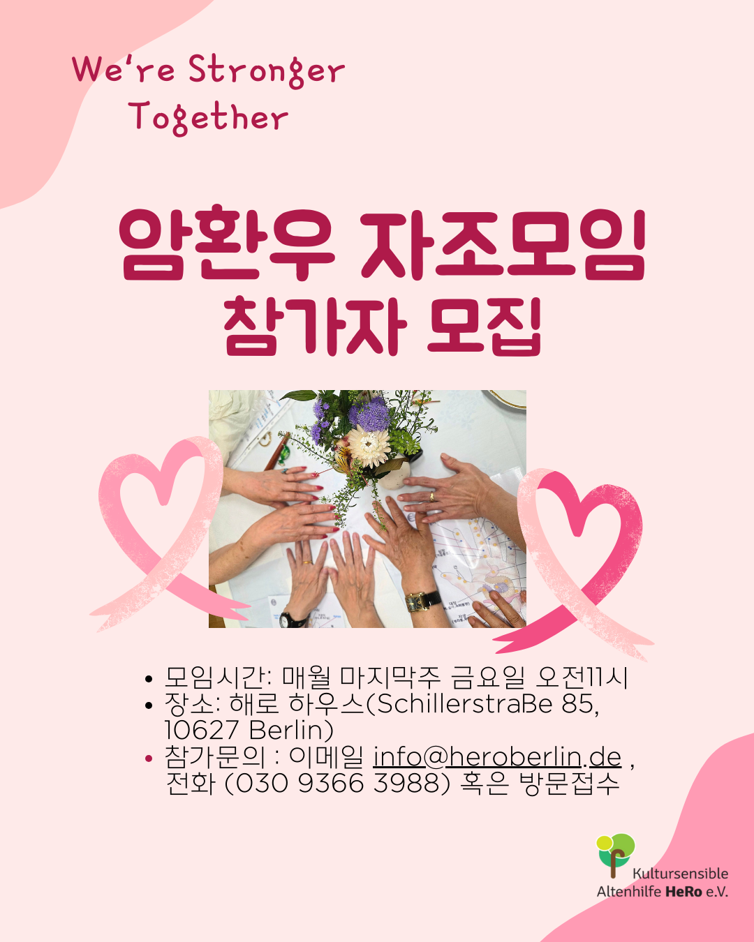 해로에서는 암환우들을 위한 자조모임을 진행하고 있습니다. 모임에서 암치료 과정에서 겪는 정서적 어려움을 나누고 심리적 지지와 위로를 받고 있습니다. 치료 정보, 투병경험, 건강 식단 등 유용한 정보도 공유하고 의미있는 여가 활동을 같이하며 서로 힘을 얻는 모임입니다. 본인이 환우이시거나 주위에 지인분이 계시다면 주저말고 같이 하시길 소망합니다. ▪︎ 참가비: